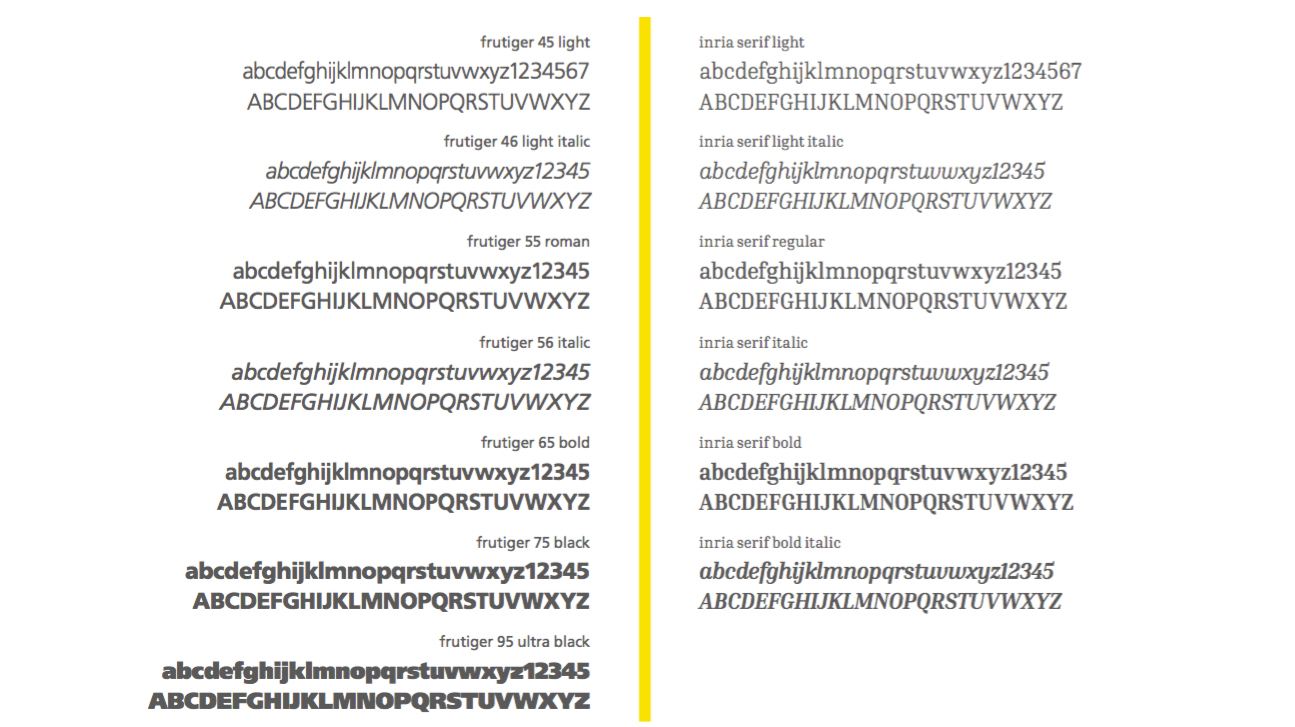 我们使用Frutiger家族和完整的Inria Serif家族的七个权重。