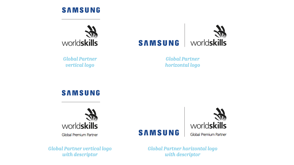 会员、地区和比赛组织者的名称被合并到标识中,并以与WorldSkills相同高度的描述文字表示。